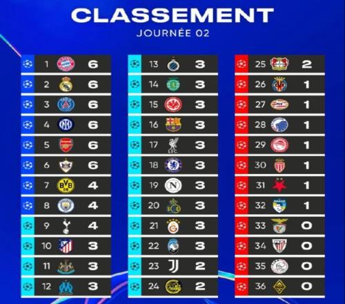 10月2日凌晨,多场欧冠比赛同时进行。至此,欧冠联赛阶段的2轮比赛全部结束。最新的积分榜上,几家欢喜几家愁。拜仁皇马等6队2连胜,而巴萨和利物浦则只有3分,药厂则位于淘汰区。