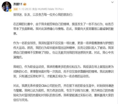 上赛季新疆和同曦的比赛第二节,齐麟因为不满裁判判罚一度暴走吃到技犯,并且在吃到技犯后还险些向裁判动手,好在被队长阿不都也拉了下来,中场休息阶段,齐麟在社媒上发了一个“39”的数字动态(裁判杨宏峰的号码),虽然赛后齐麟将这条动态删除了,但还是在赛后被CBA公司以“在比赛期间在社交平台上发表不恰当言论,违反了联赛相关规定”为由,处罚了3万元罚款。