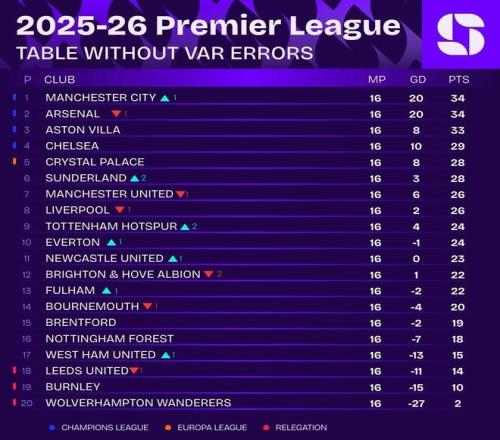 12月17日,数据机构Squawka统计了去掉有争议的VAR判罚的英超积分榜。如果没有VAR争议判罚,曼城将会反超阿森纳,上升到英超榜首的位置。