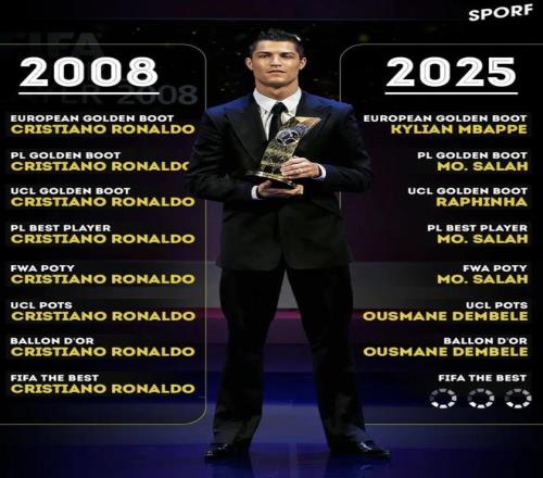 最近SPORF发布了“2008 vs 2025个人奖项对照”。这张表最扎眼的矛盾很直接:2008这一列几乎清一色都是C罗的名字,从金靴到年度最佳再到金球,基本一条线打穿;而2025这一列却被拆成了几个人各拿一块,姆巴佩、萨拉赫、拉菲尼亚、登贝莱轮流上榜。同样是顶级个人荣誉,呈现出来的却是“一个人横扫”和“多人分摊”两种完全不同的画面。