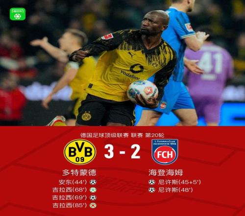 北京时间2月2日德国足球顶级联赛 联赛 第20轮,多特蒙德主场对阵海登海姆。上半场拉马伊脱手,安东破门,之后马内突然受伤,尼许斯破门扳平。下半场尼许斯远射折射破门完成双响反超比分,之后多施手球送点,吉拉西主罚命中扳平比分,随后吉拉西一分钟内再度破门火速反超,之后吉拉西将自己创造的点球打飞。最终多特3-2战胜海登海姆。
