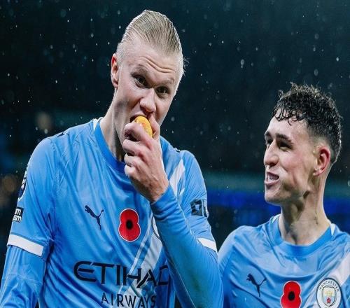 有趣一幕,与利物浦比赛期间哈兰德和福登吃了看台扔下的苹果